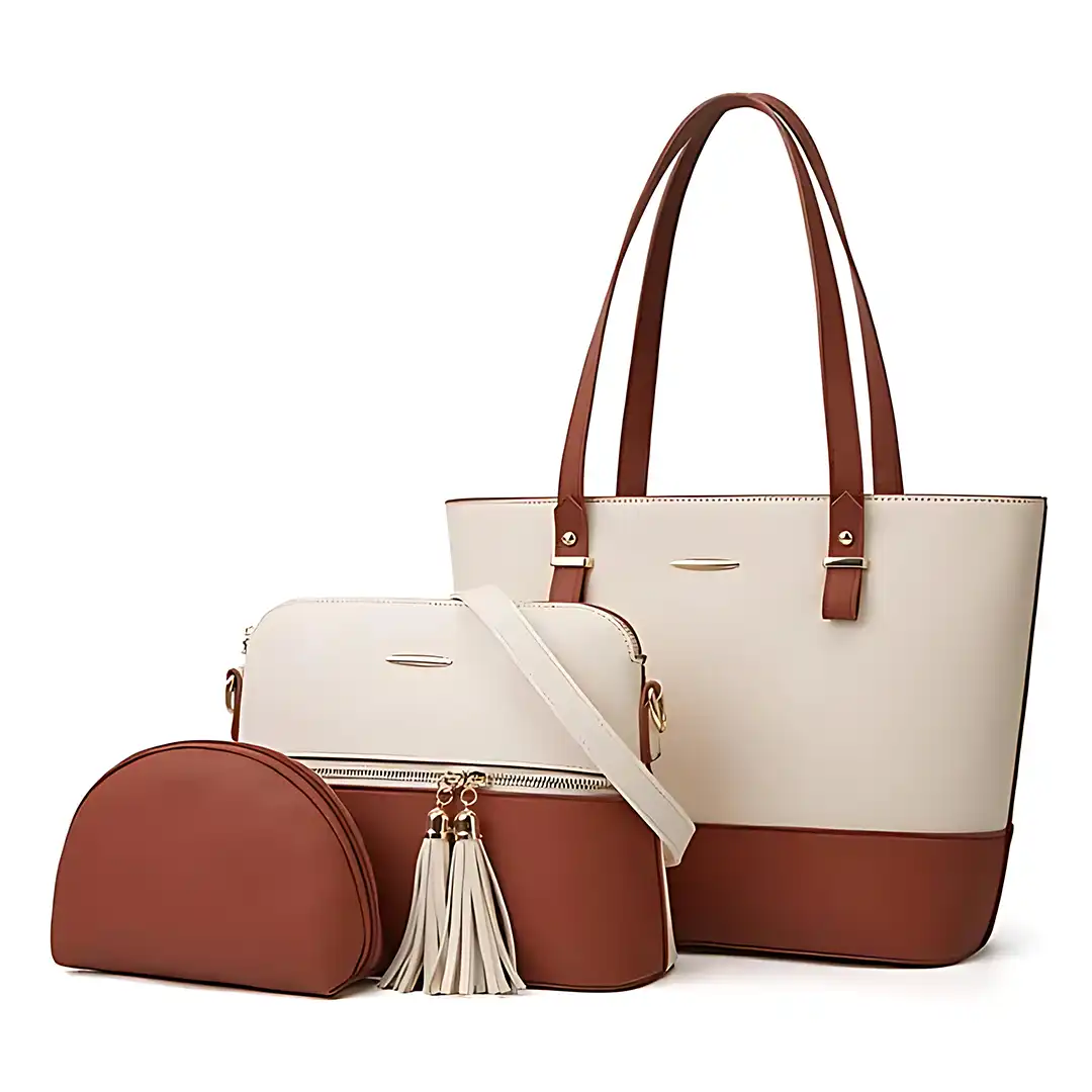 Viva 3 in 1 Tote Handbag For Women- Mustrad Brown& White